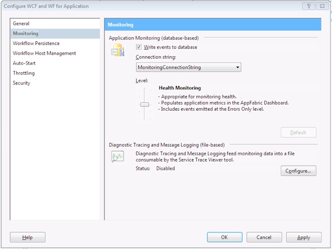 When you set up monitoring you need to provide a connection string name and set the monitoring level. As a minimum, the level needs to be set to Health Monitoring to populate the AppFabric dashboard. Below this are the levels Off and Errors Only which are self explanatory. Above this level are End-to-End Monitoring and Troubleshooting both of which capture additional information. End-toEnd Monitoring adds a header into WCF traffic to allow a logical call sequence to be followed. When a WCF service calls another WCF service the header is flowed across the call providing a correlation token for querying by. Note that the capture levels are cumulative, the higher level setting includes all of the events from the settings below. The higher the setting, the greater the impact on the performance of the system as more resources are required to capture and log the monitored events. For day to day operations health monitoring is recommended with the more verbose options used when required to aid troubleshooting. The connection string is a named connection string value, set as a property of the web application (or one of its ancestors). The connection string dashboard page is available from the ASP.NET section of the Features View for the web application.