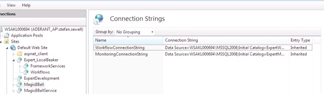 Note that IIS configuration is hierarchical, the connection strings available to the Magic8Ball web application are both inherited which means they are defined at a higher node in the tree. In this case the strings are defined in the machine web.config found at %SystemDrive%\Windows\Microsoft.NET\Framework64\v4.0.30128\Config (I’m using 64-bit Windows and .NET 4.0 RC). When installing AppFabric the default connection strings are written into the machine level web.config. In my case, both connection strings are set-up to use integrated security.