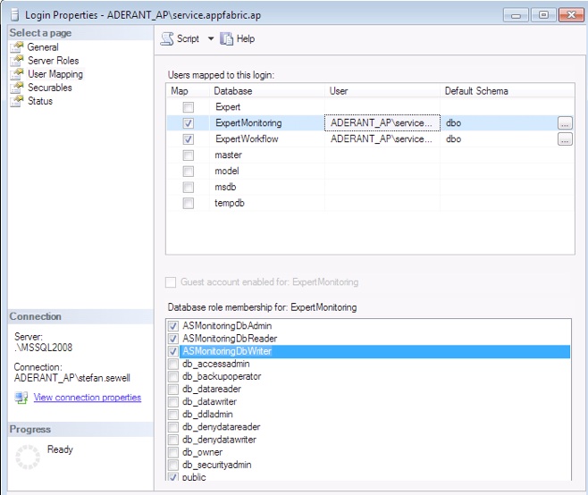 This account needs to have login rights to the SQL Server and should be mapped to the ASMonitoringDbWriter role. In my case I’ve mapped the user to all three roles set up in the monitoring store.