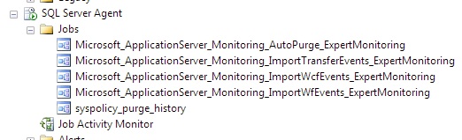 The SQL Server Agent must be running on for the tables to be populated. The Import*Events jobs run every 10 seconds by default, if they are not correctly set up your application event log soon fills up with errors and warnings (as I found). These jobs call stored procedures defined in the monitoring database: ASImportTransferEvents, ASImportWcfEvents, ASImportWFEvents and run as the AS_MonitoringDbJobsAdmin. The AutoPurge job is scheduled to run once every minute and calls the ASAutoPurge stored procedure. These stored procedures in turn call ASInternal_* versions of themselves and you can drill into the SQL to see exactly what they do. To housekeep the monitoring database you can use the Clear-ASMonitoringSqlDatabase command. An other option is to move the events to an archive database so that the queries feeding the dashboard remain responsive, see Set-ASMonitoringSqlDatabaseArchiveConfiguration. The archive database can then be managed as per any audit requirements you may have.