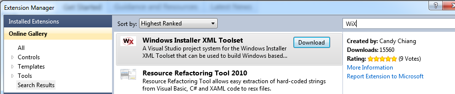While it is possible to work directly from the command line, the Visual Studio integration is a compelling option. While the Extension Manager Online gallery contains a WiX download:
