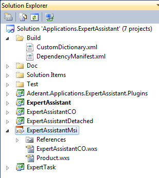 The obj/Debug subfolder will contain the generated wxs file and the wixobj files compiled from them. The bin\Debug subfolder is the default location for the MSI. The two files of interest are the ExpertAssisantCO.wxs, which contains the files from the referenced ExpertAssistantCO project and the Product.wxs which contains configuration information for the installation process. Building the project will invoke the WiX tooling: candle, preprocesser that transforms .wix into .wixobj, and light, processes wixobj files to create an MSI.