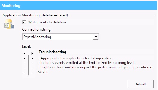 As I wanted events from this service to be added to my AppFabric monitoring store, I also added a connection string to the mapped web application and then configured AppFAbric monitoring to use that connection.