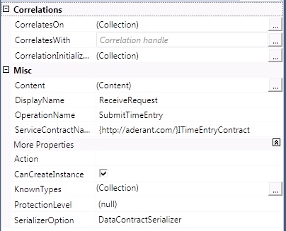 This is such a simple service that I don’t need any correlation between messages, it just receives and processes the message without communicating back to the sender of the message. Therefore I also cleared out the CorrelatesOn and the CorrelationInitializer properties.