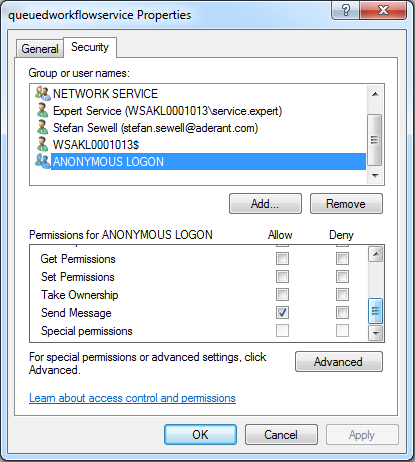 We needed a quick proof of concept to show that a workflow service could be activated via a message sent over MSMQ. First part was workflow design and coding, this was the easy part. All I wanted to do was accept a custom type, in this case a TimeEntry, from a SubmitTime service operation that belonged to an ITimeEntryContract. On receiving the time entry I would simple log the fact that it arrived into the event log. This is pretty much the “Hello, World!” of the services demos. The second part was getting the configuration correct…