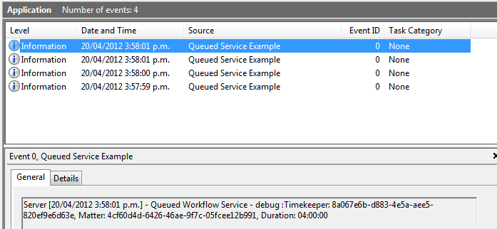 EventLog.WriteEntry(“Queued Service Example”, message, EventLogEntryType.Information);