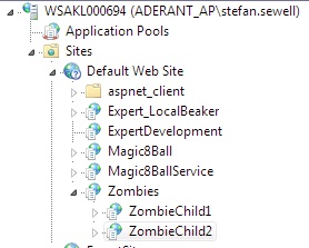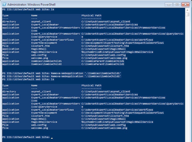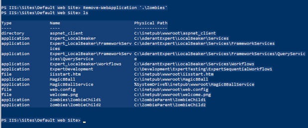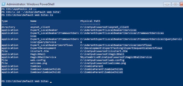 With the application pool in place and configured, we next set-up the web application itself. The New-WebApplication command is all we need, giving it the site, application name, physical file system path and application pool.